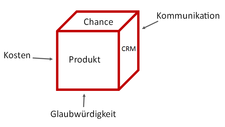 Konkret heisst das, dass zum Beispiel ein schlechtes Produkt nicht mit guter Kommunikation oder mit tiefen Kosten (Preis) wettgemacht werden kann. Genauso wenig wie eine grosse Marktchance nicht mit wenig Kommunikation wahrgenommen werden kann. Oder gutes, ausgereiftes CRM die Glaubwürdigkeit für den Kunden herstellt. Ich weiss es holpert ein wenig.